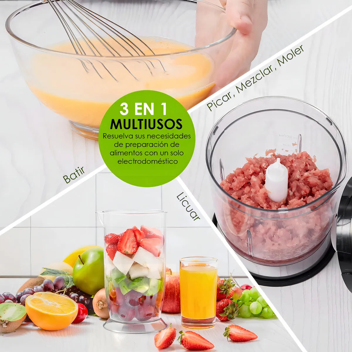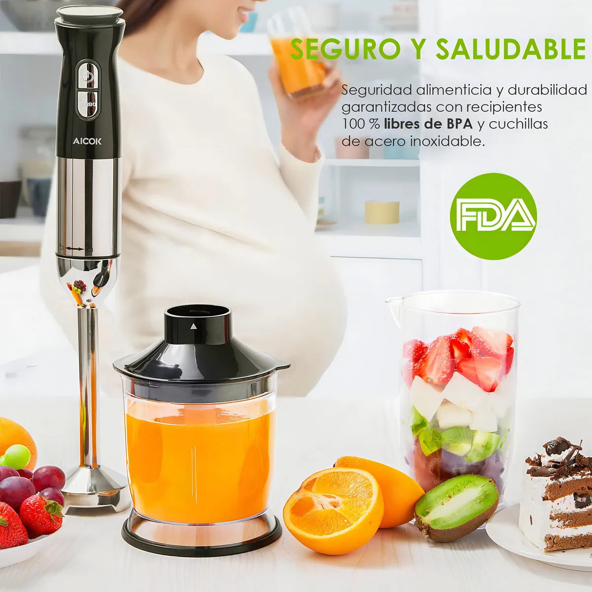 La batidora de mano Aicok de 700 mL en negro y plata permite preparar smoothies, batidos, salsas y mezclas directamente en cualquier recipiente con facilidad. Su motor potente y las cuchillas de acero inoxidable aseguran resultados uniformes y consistentes. Compacta y ligera, es ideal para uso diario en la cocina.