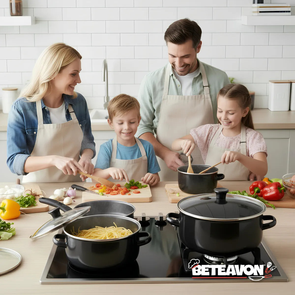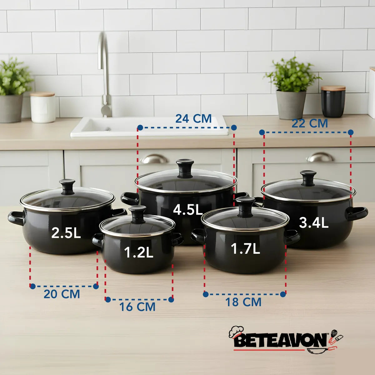 El set de 5 ollas de peltre color negro BEJO5PNE está diseñado para brindar durabilidad, funcionalidad y un estilo sobrio y elegante en la cocina. Fabricadas en acero al carbono con recubrimiento esmaltado, estas ollas permiten una excelente distribución del calor, ideal para la preparación de sopas, guisos, pastas y platillos de uso diario. Incluyen tapas de vidrio templado que facilitan la supervisión de la cocción sin necesidad de destapar, ayudando a conservar el calor y los sabores. Su acabado en color negro aporta una apariencia moderna y versátil que se adapta a cualquier estilo de cocina.