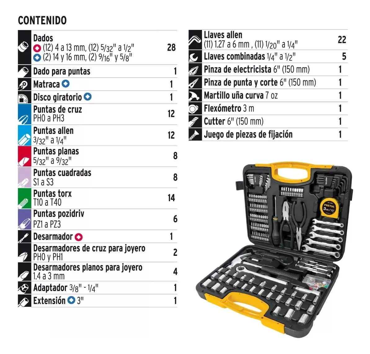 • Incluye destornilladores, llaves, alicates, martillo y más